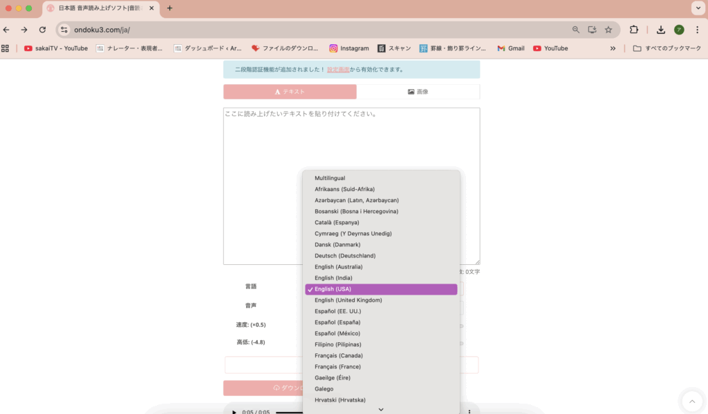 言語・音声(キャラクター)・速度・声の高低を選択します。